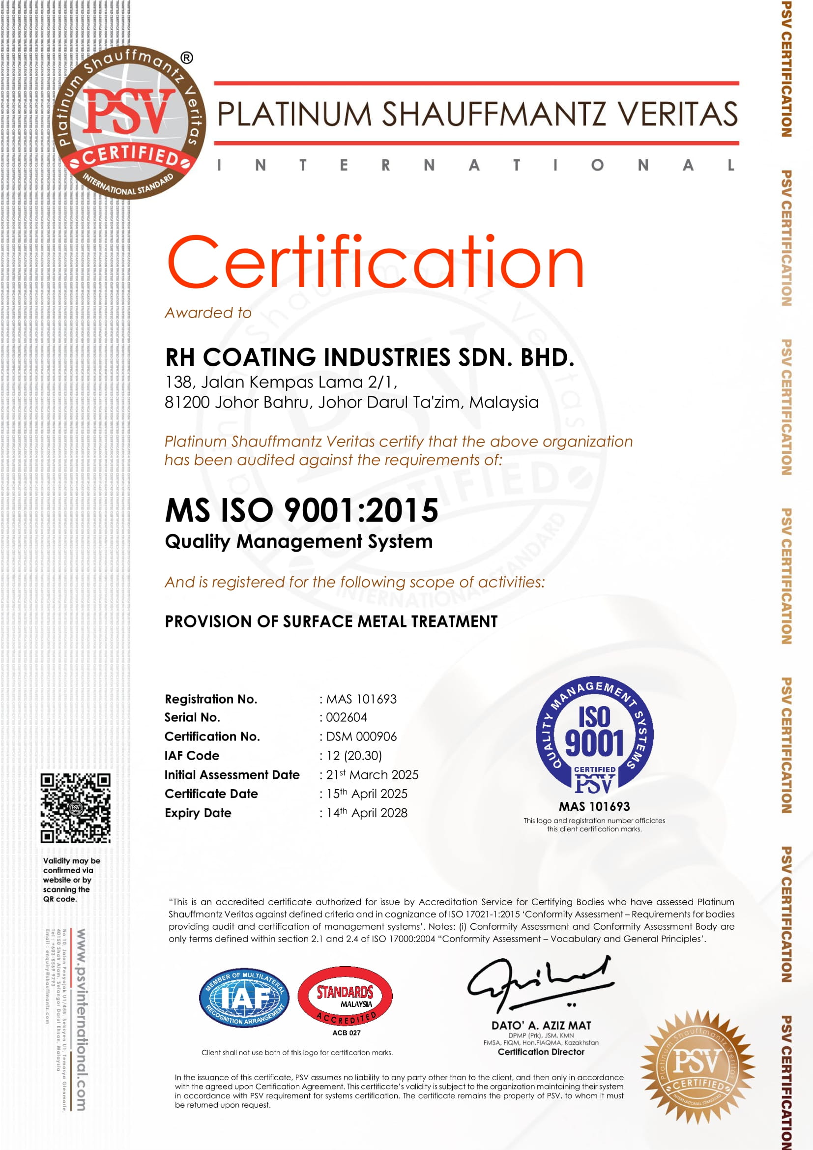 RH Coating Industries Sdn Bhd ( formerly known as RH Coating Enterprise), is a fully bumiputera owned company, based in Johor Bahru, Malaysia that specializes in the manufacturing and application of coatings and paints. The company is involved in providing coating solutions for a variety of industries, including automotive, construction, industrial and marine sectors. RH Coating Industries Sdn Bhd is known for offering products such as industrial coatings, protective coatings, teflon coating, and related services.